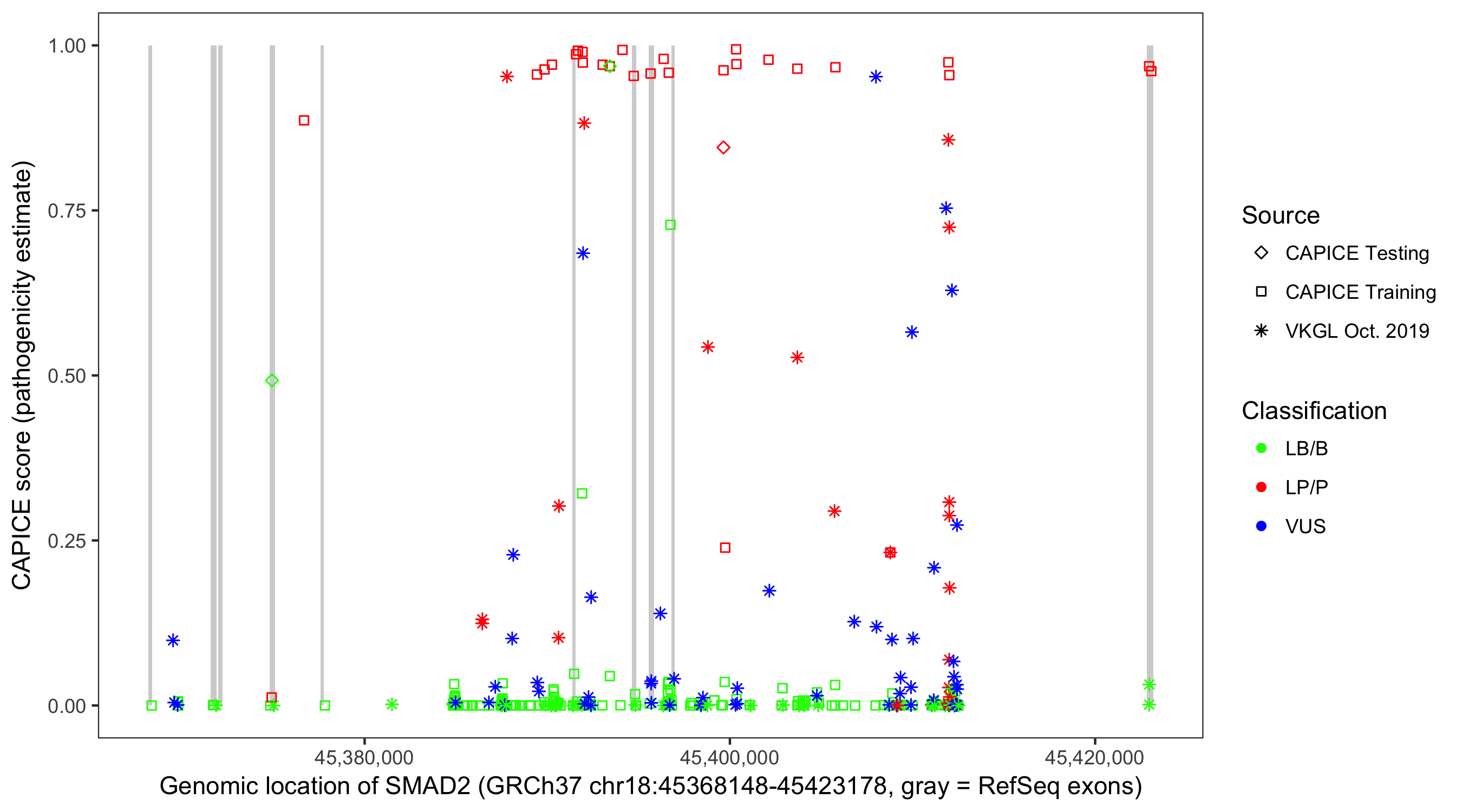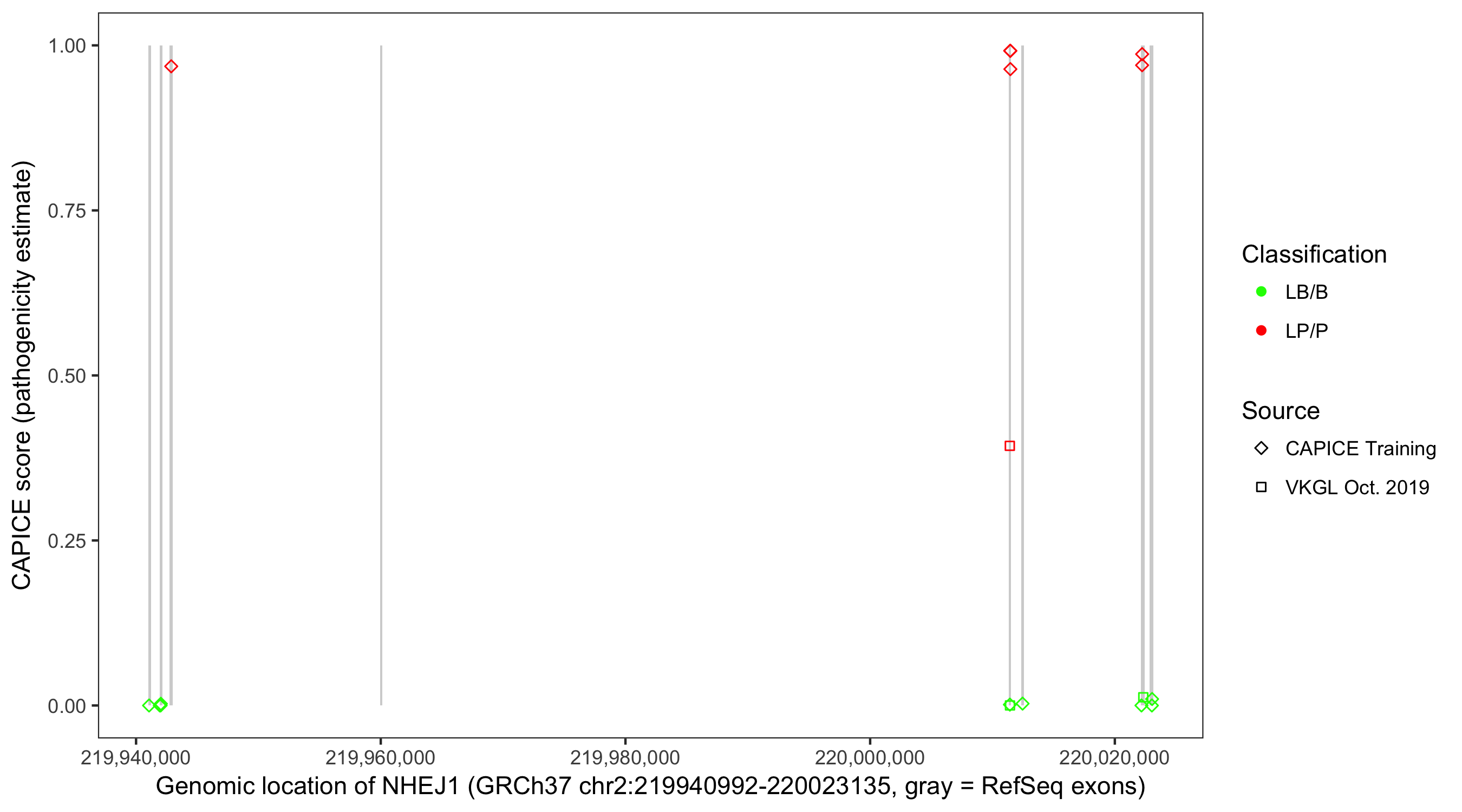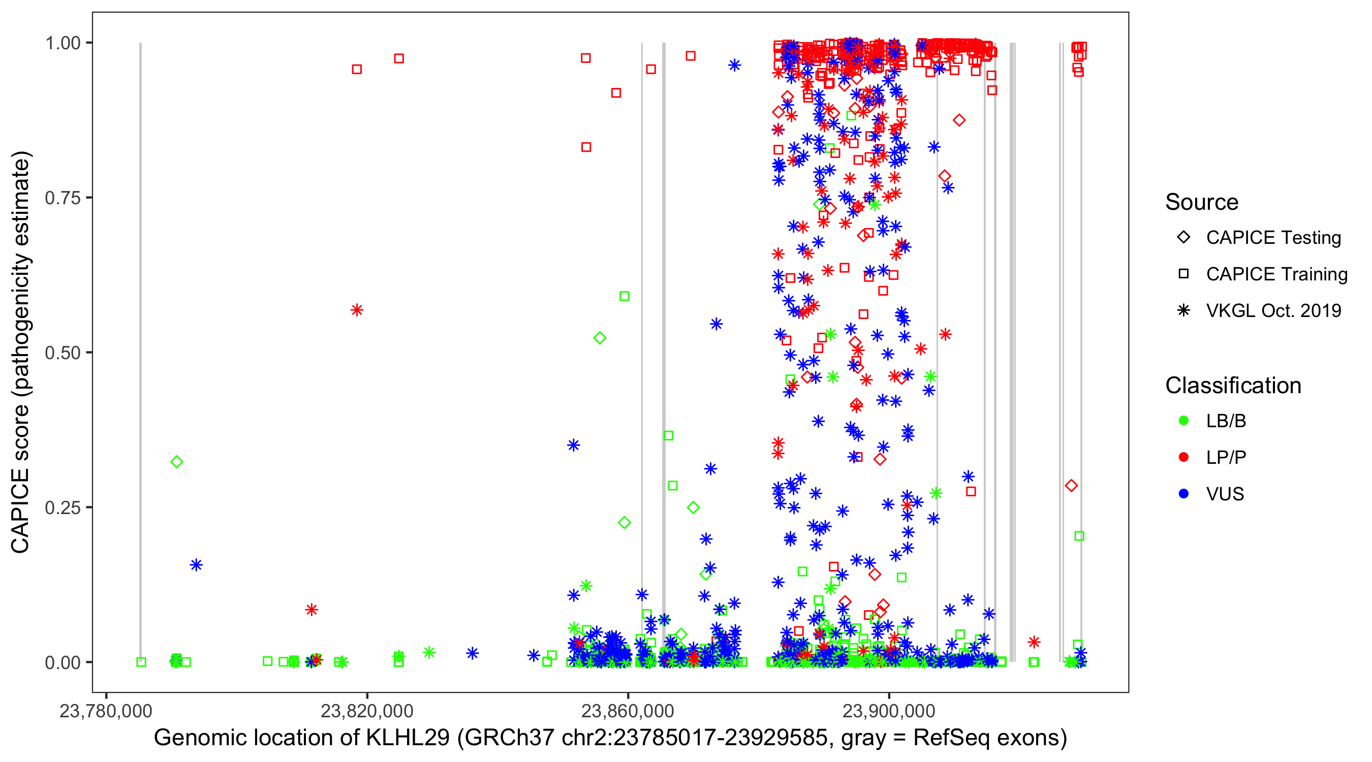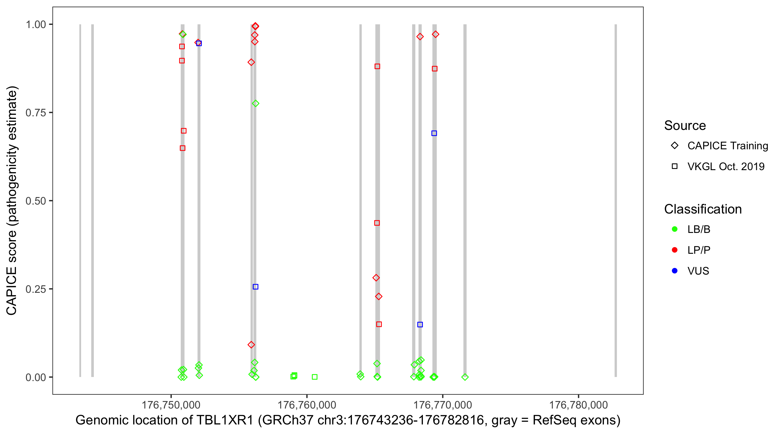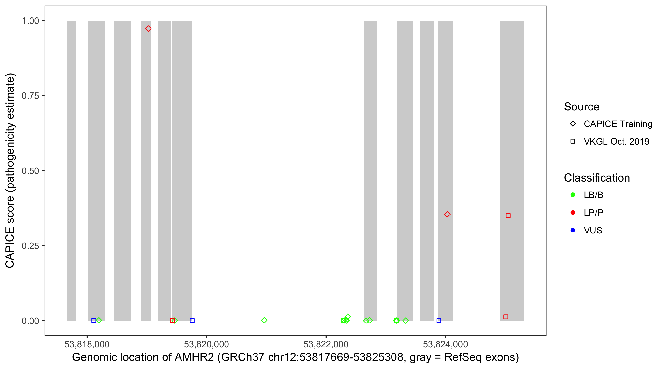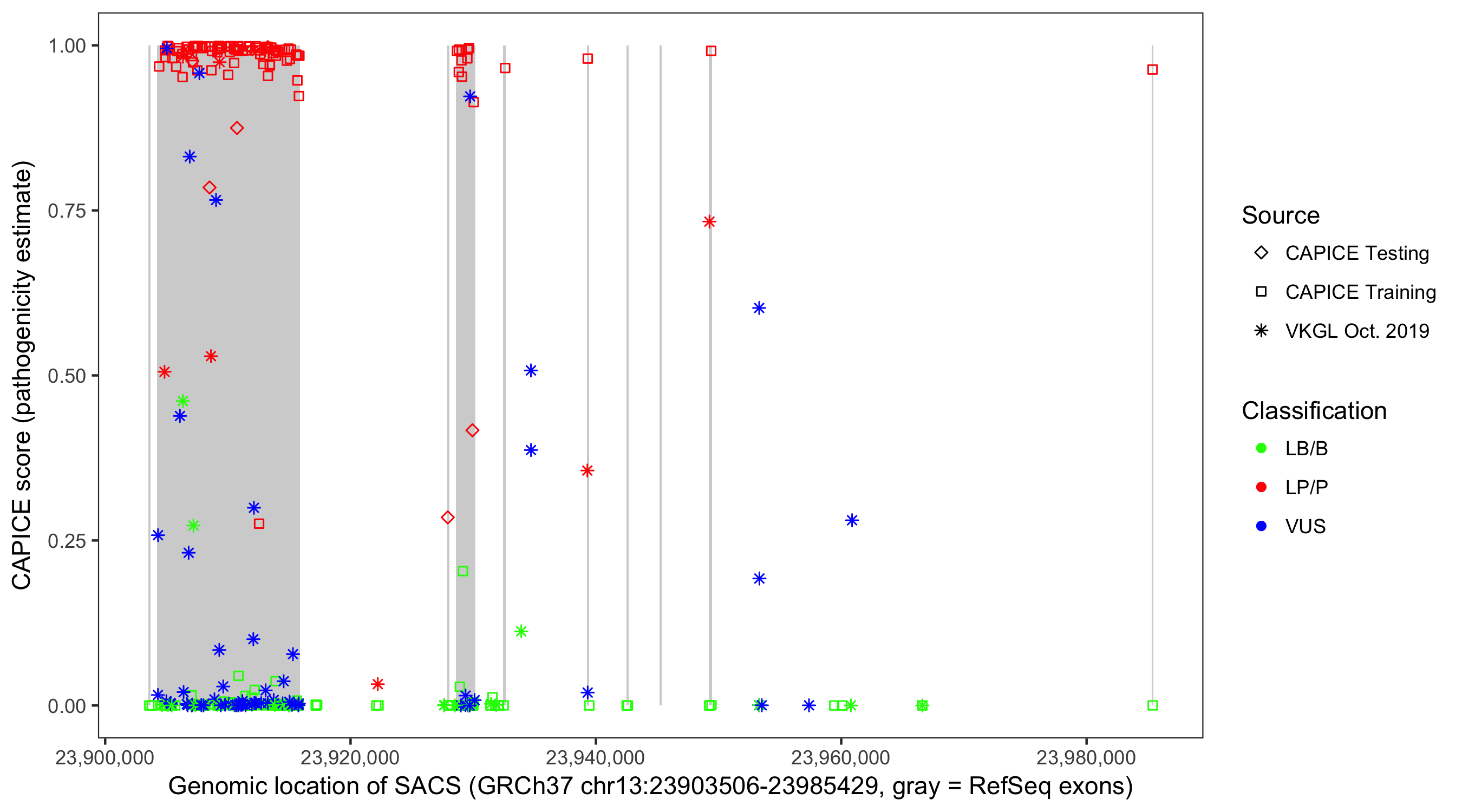 Shown are CAPICE train/test variants plus VKGL Oct 2019.