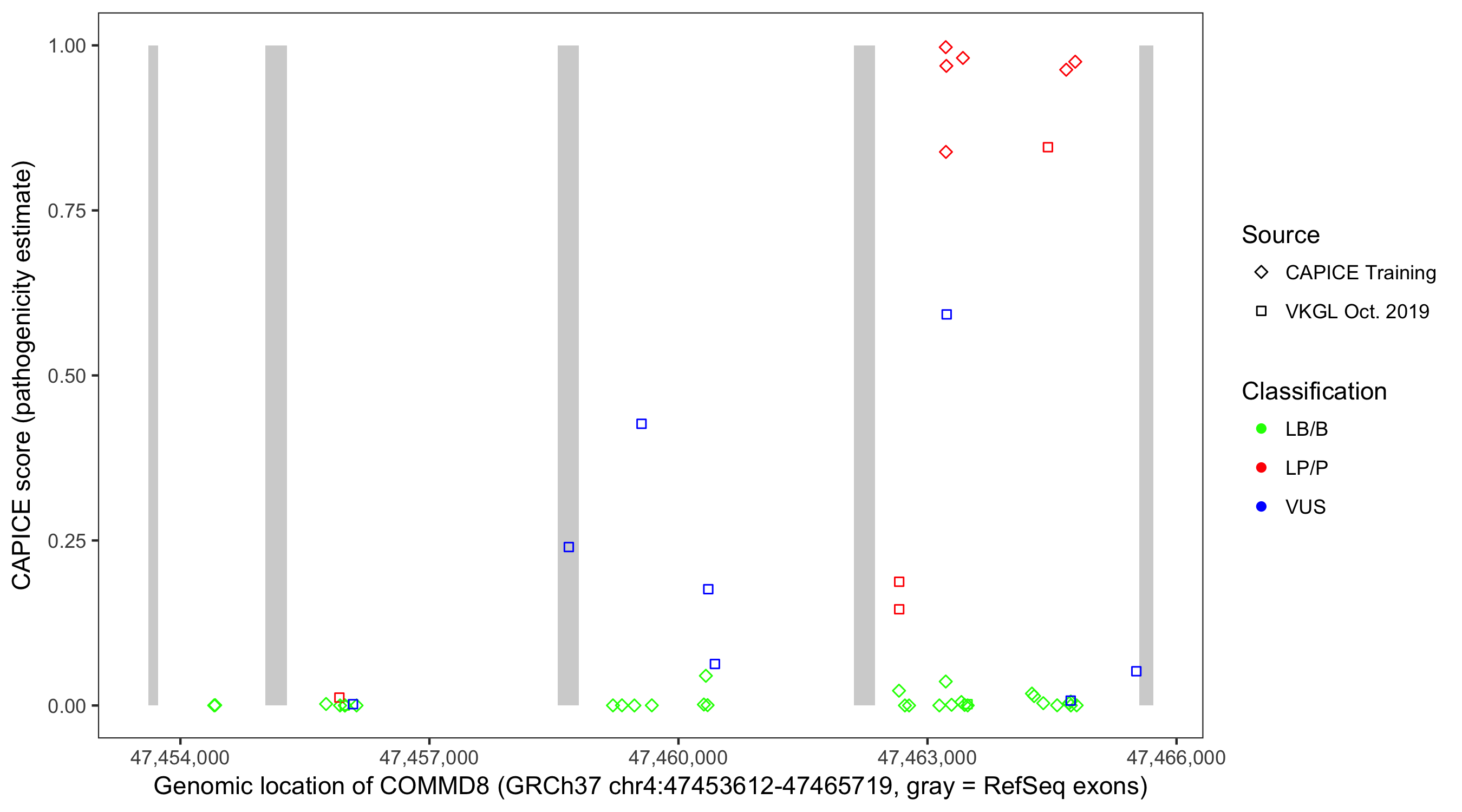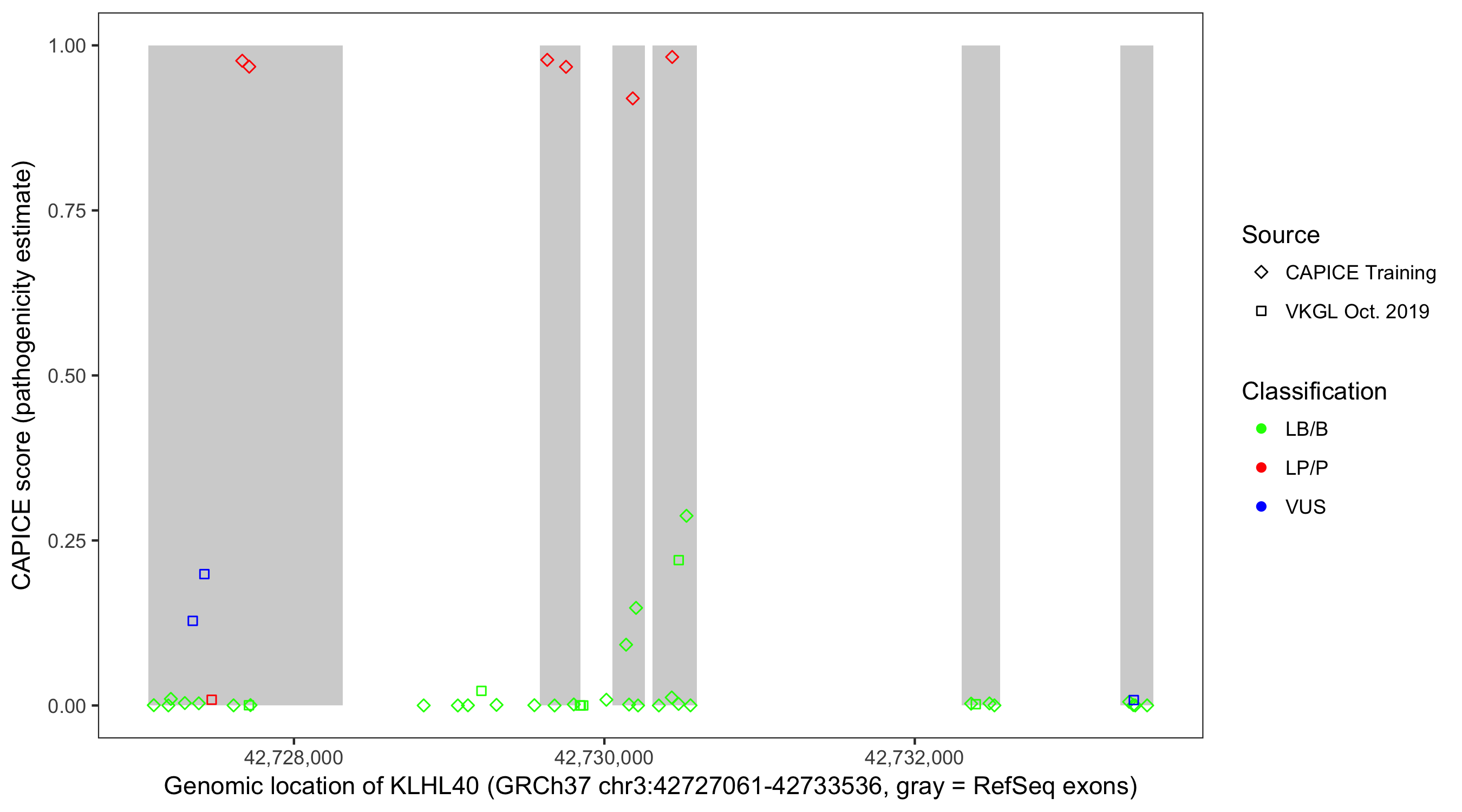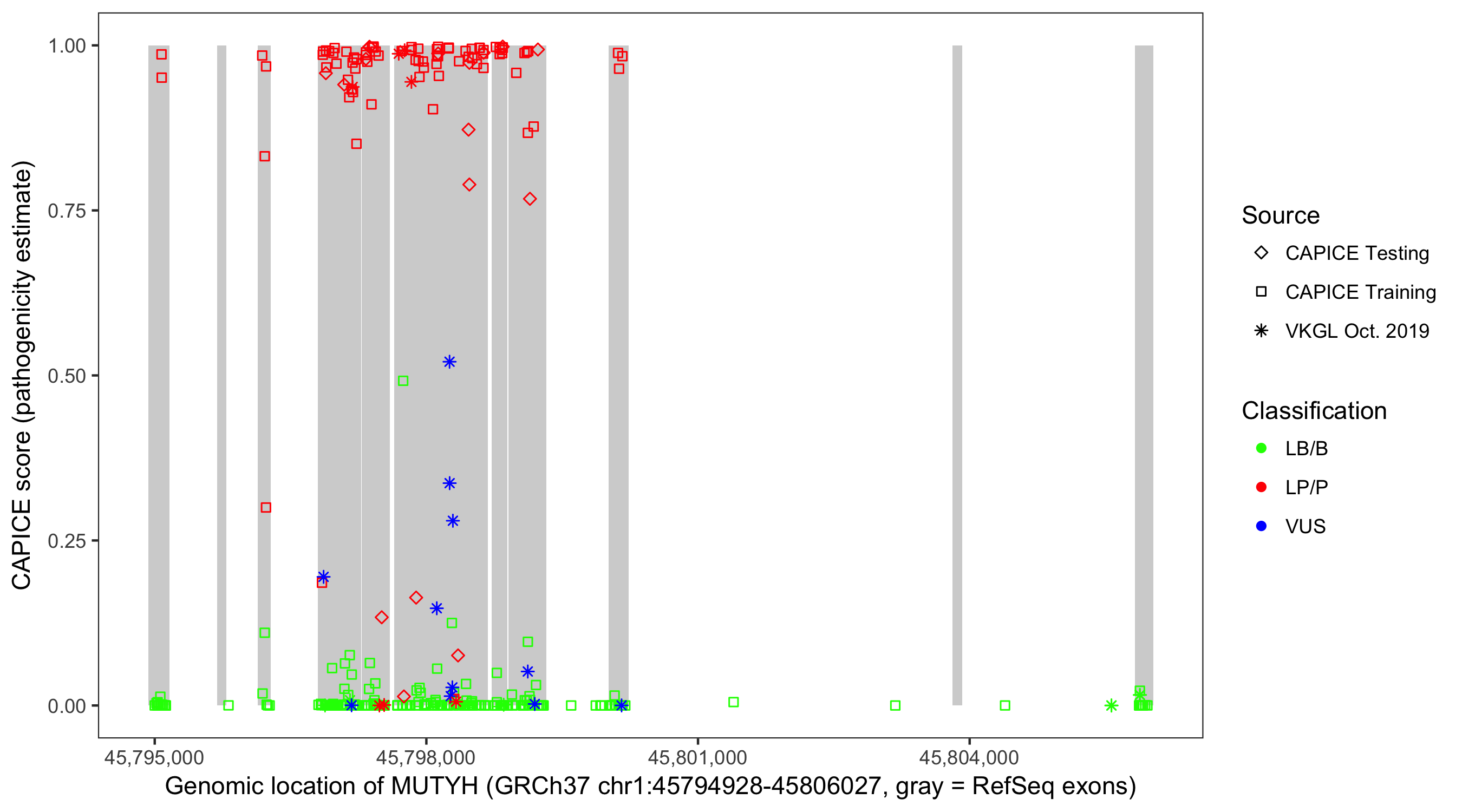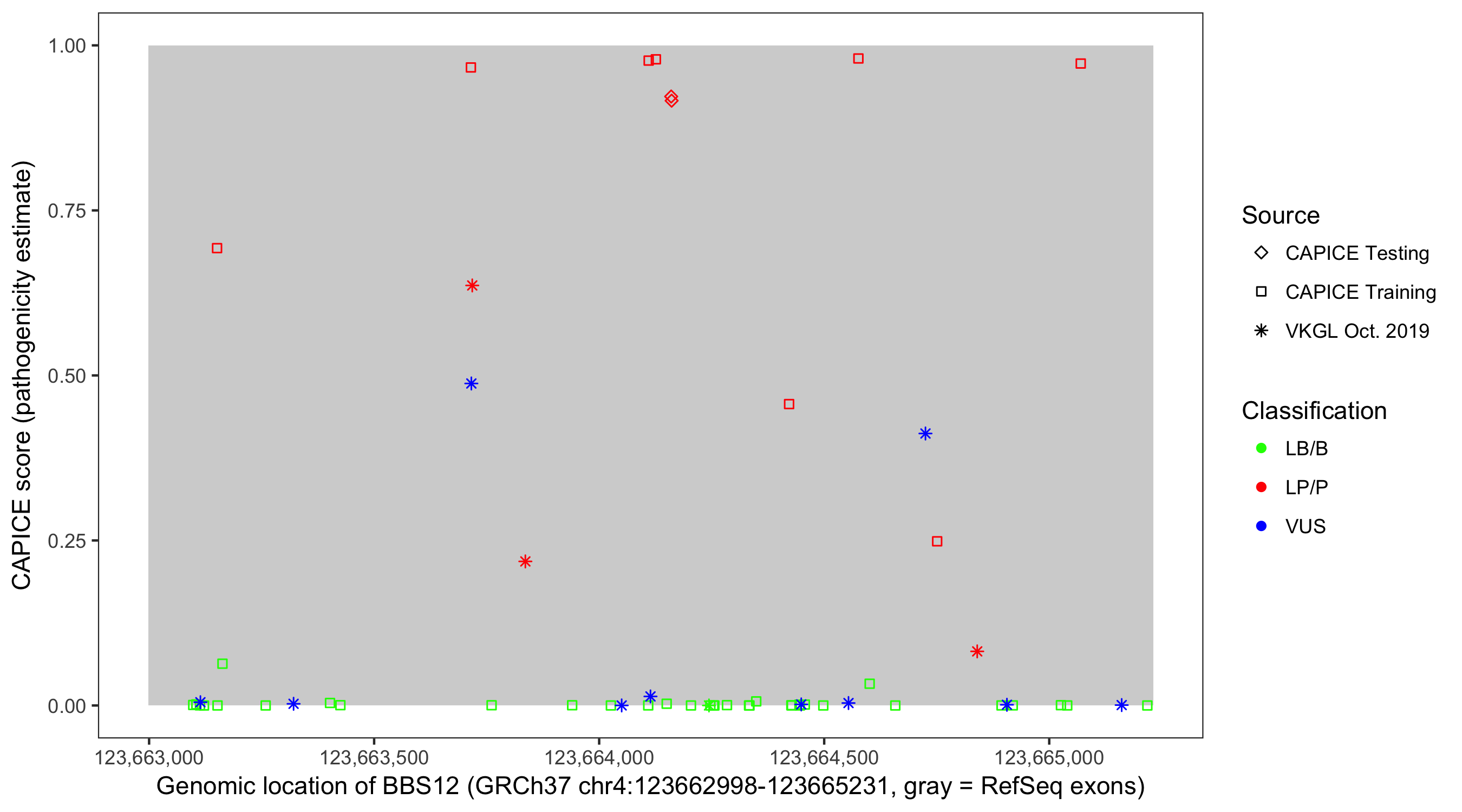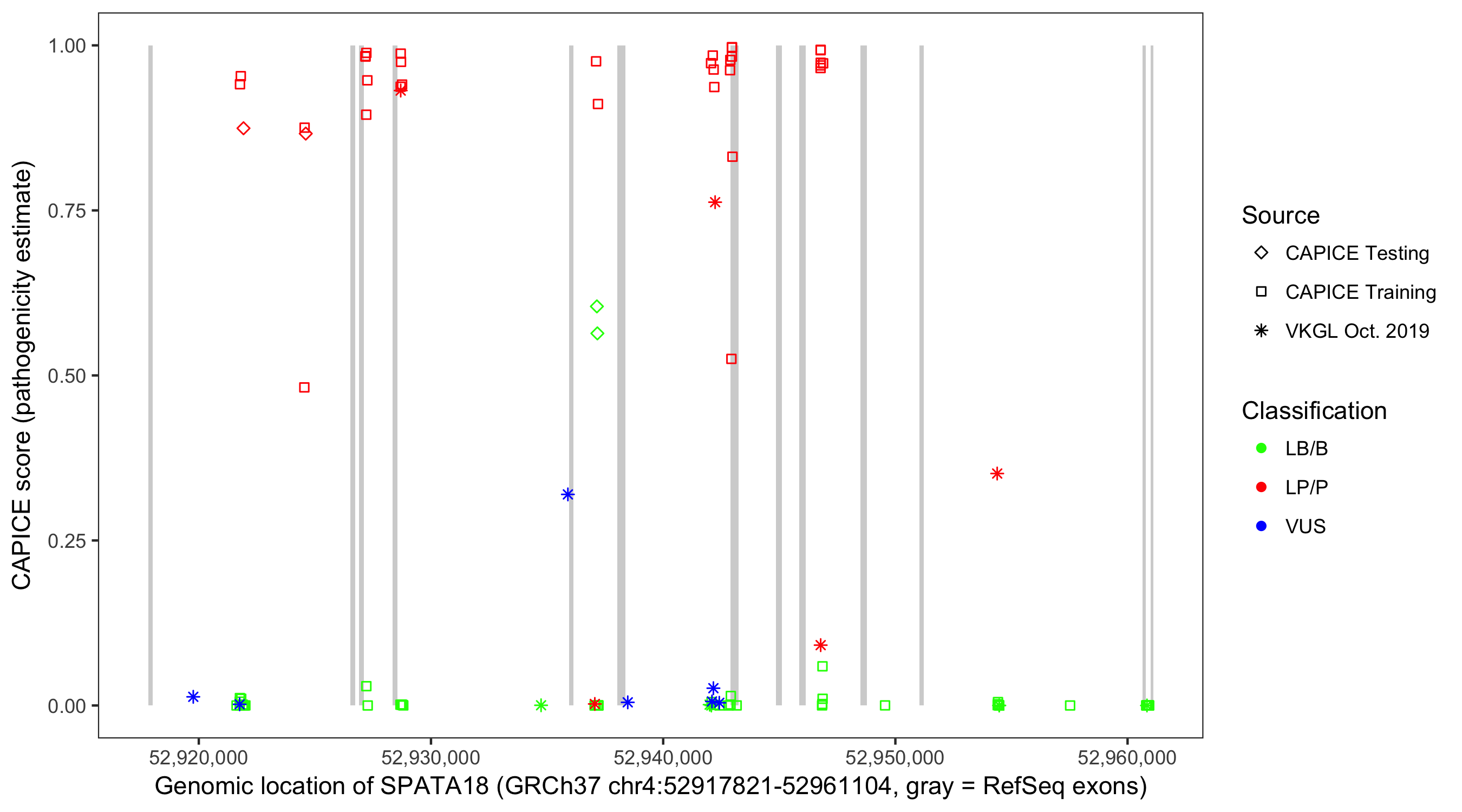 Shown are CAPICE train/test variants plus VKGL Oct 2019.