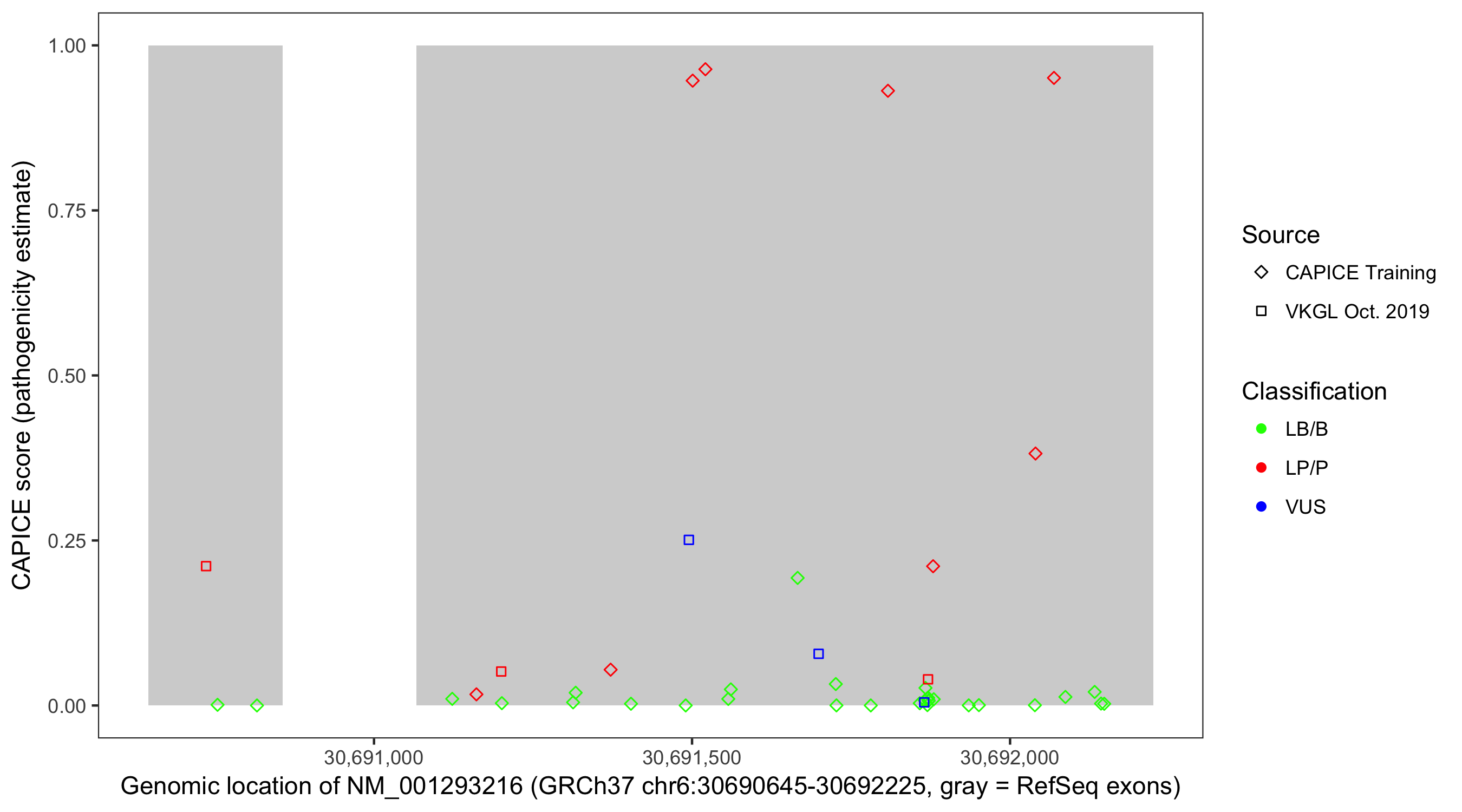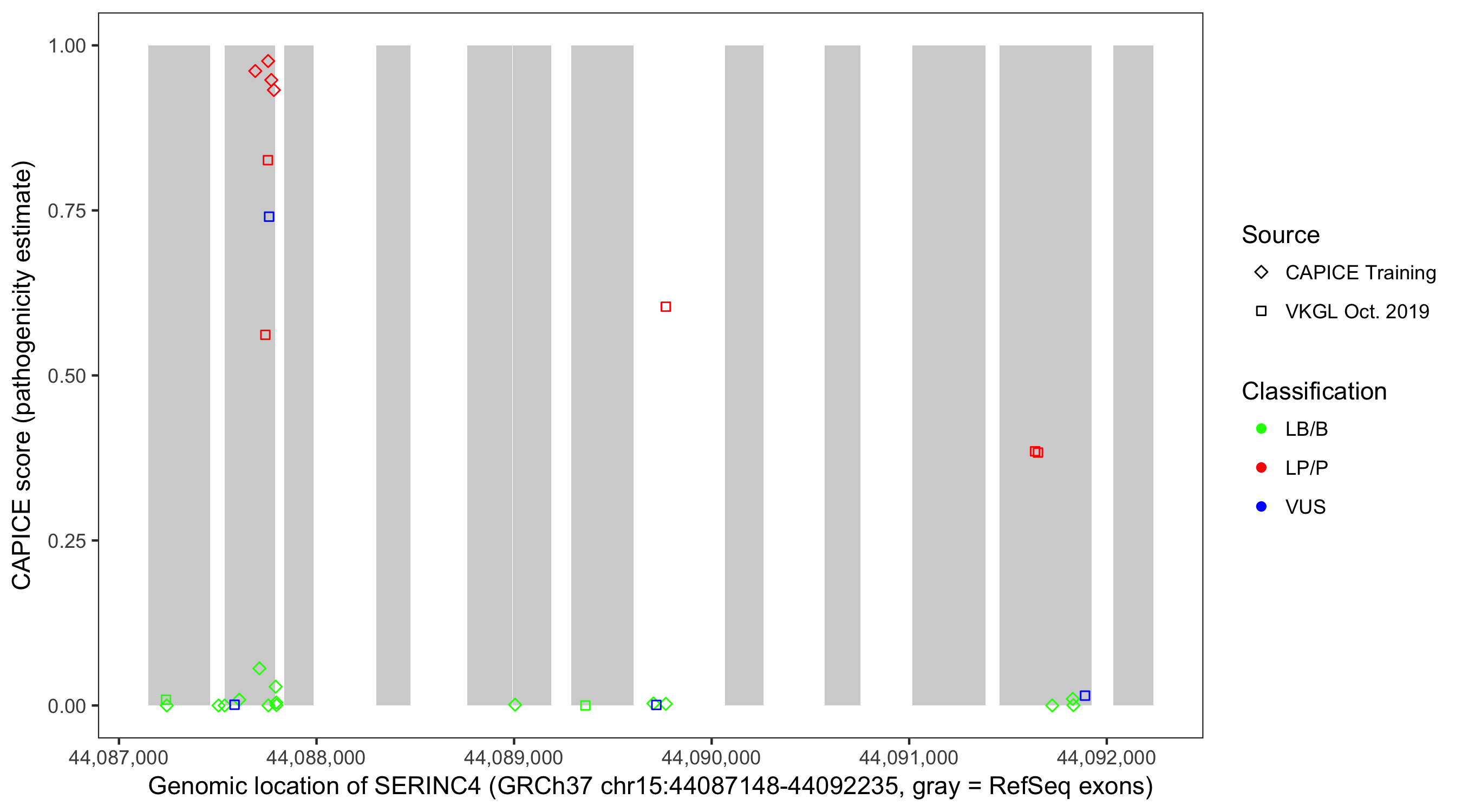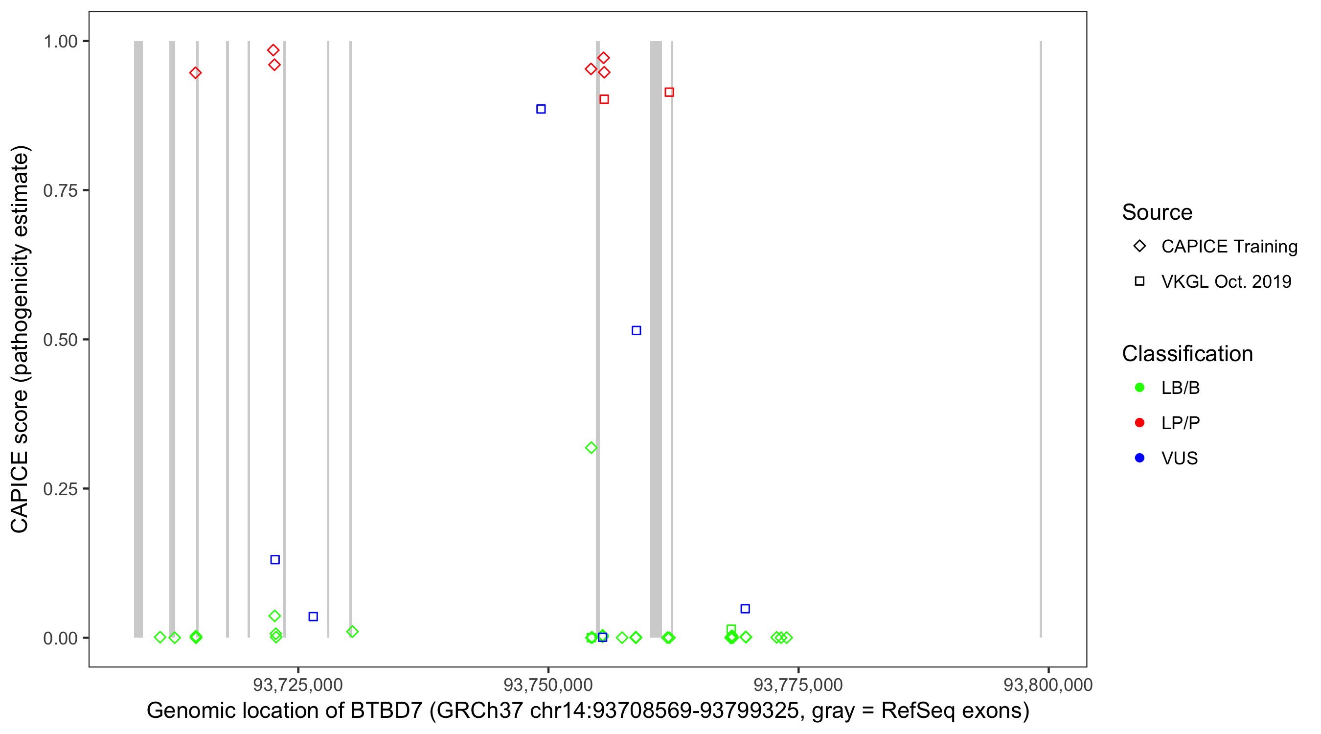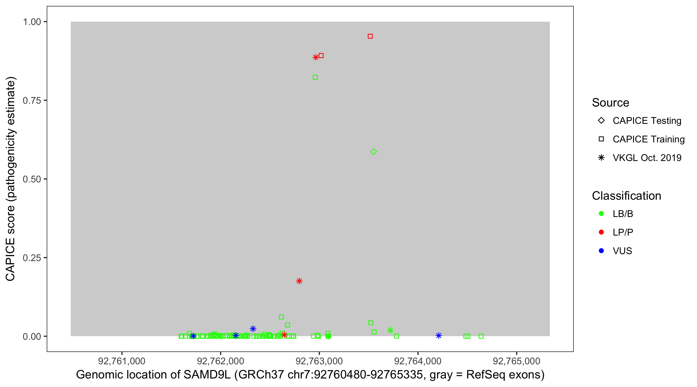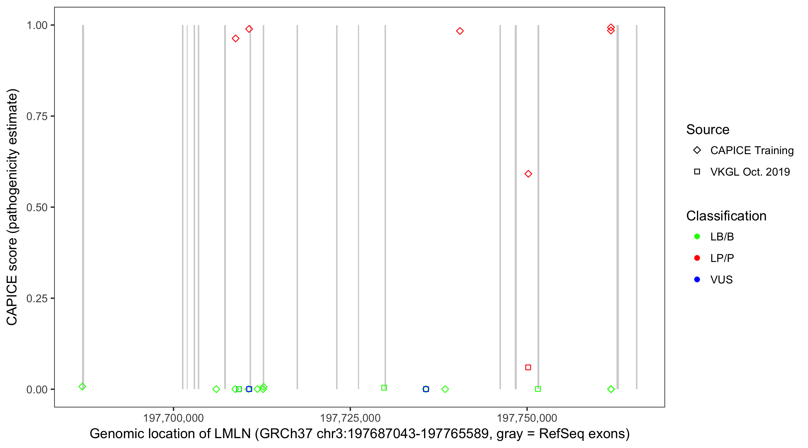 Shown are CAPICE train/test variants plus VKGL Oct 2019.