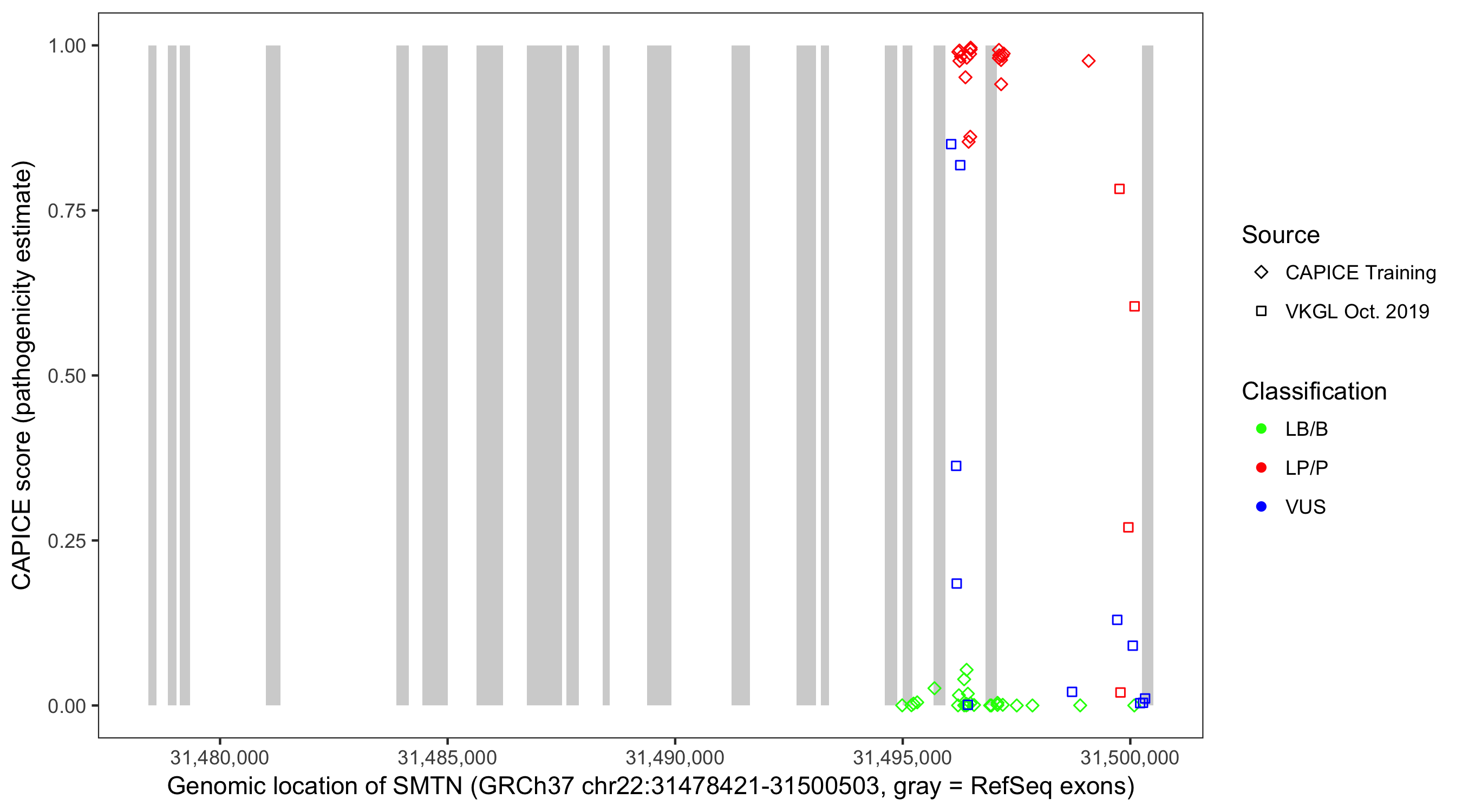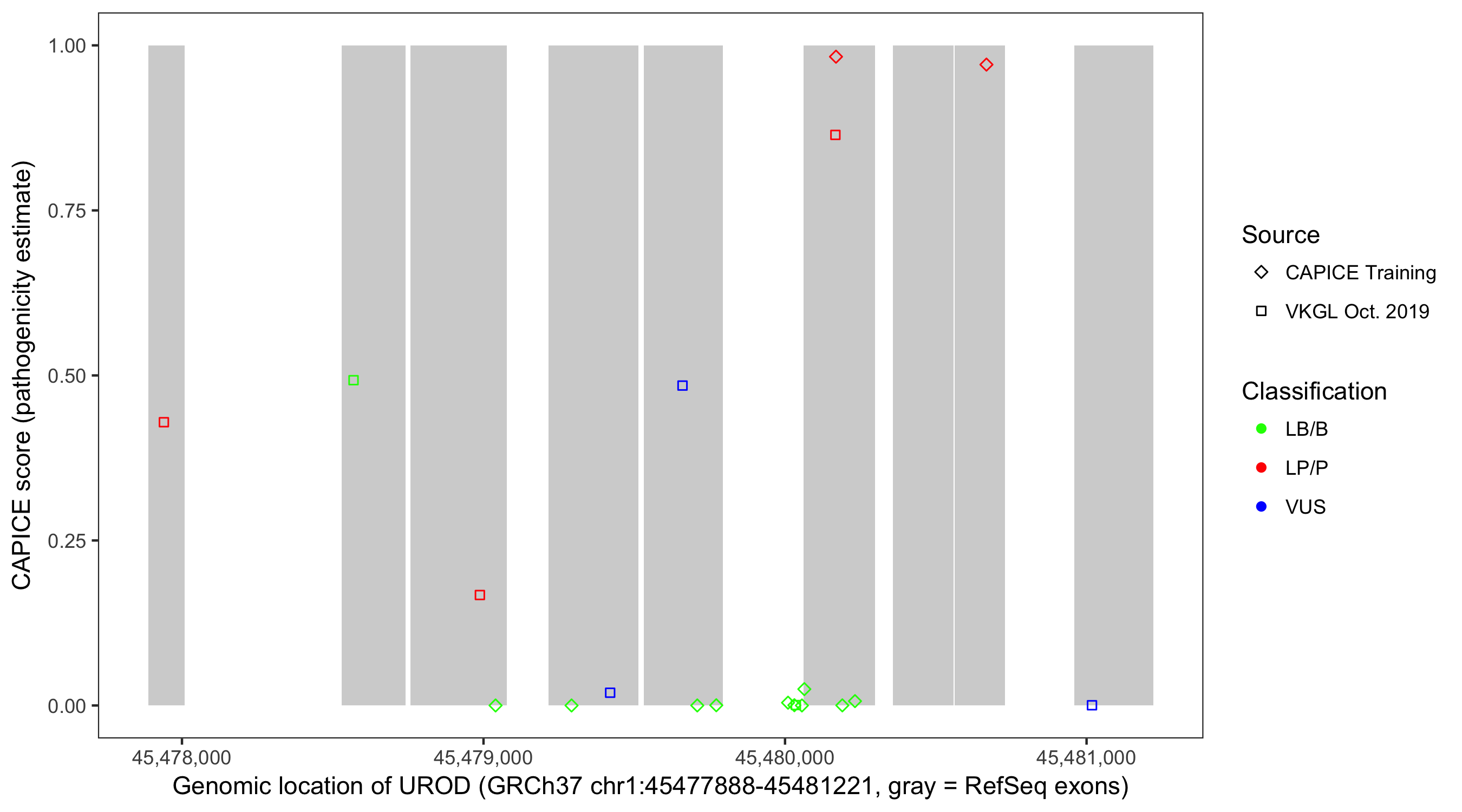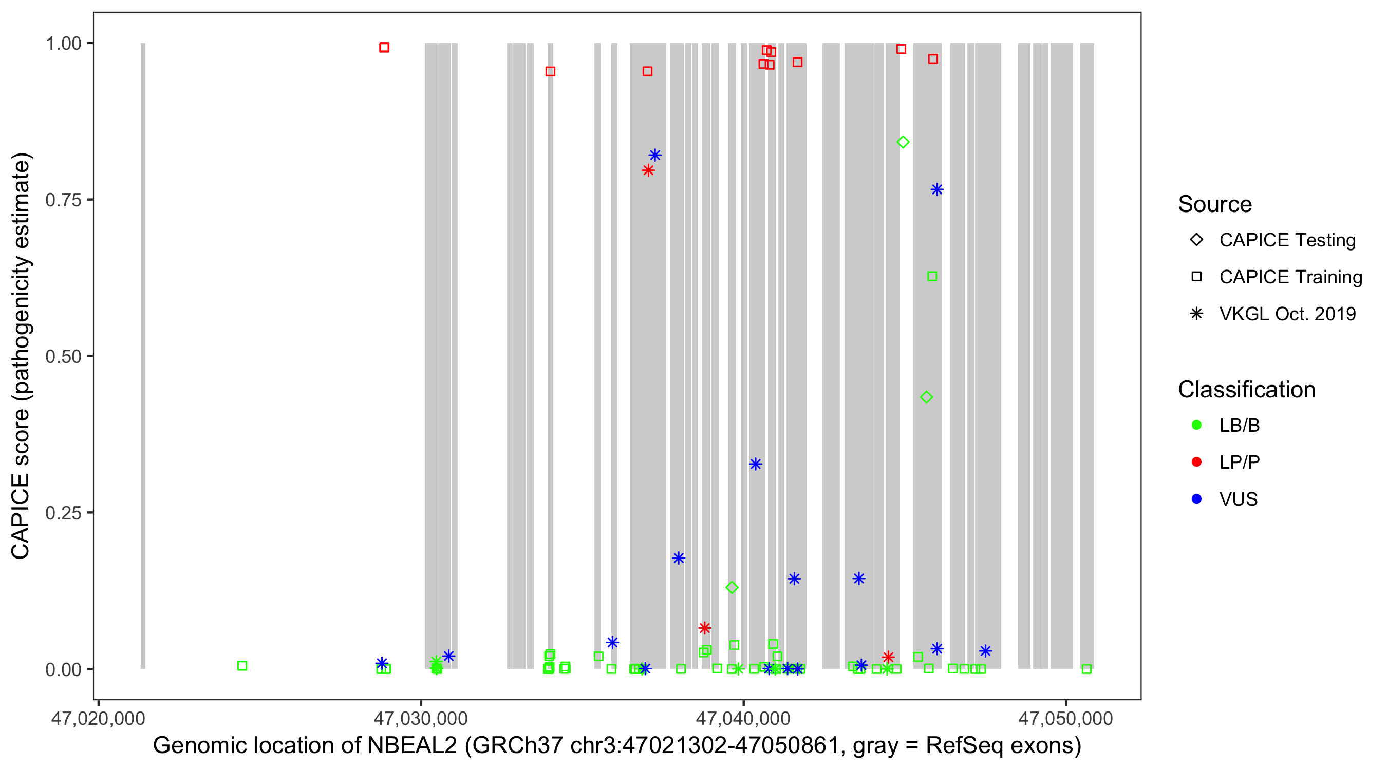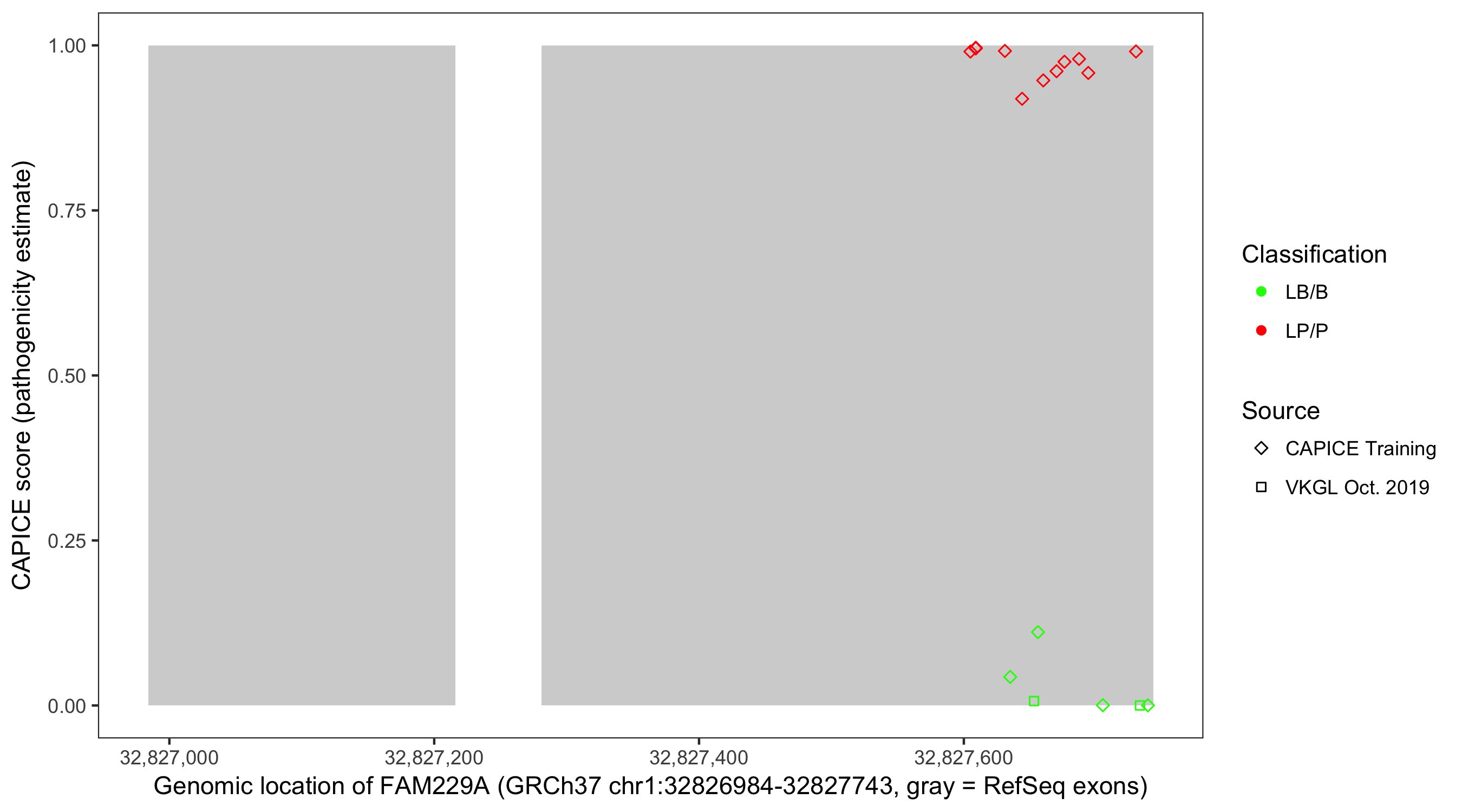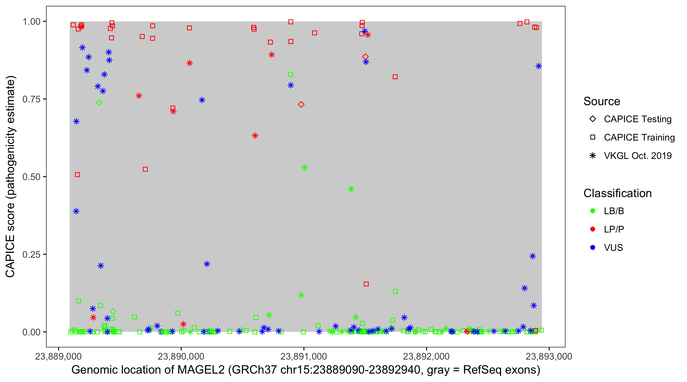Shown are CAPICE train/test variants plus VKGL Oct 2019.