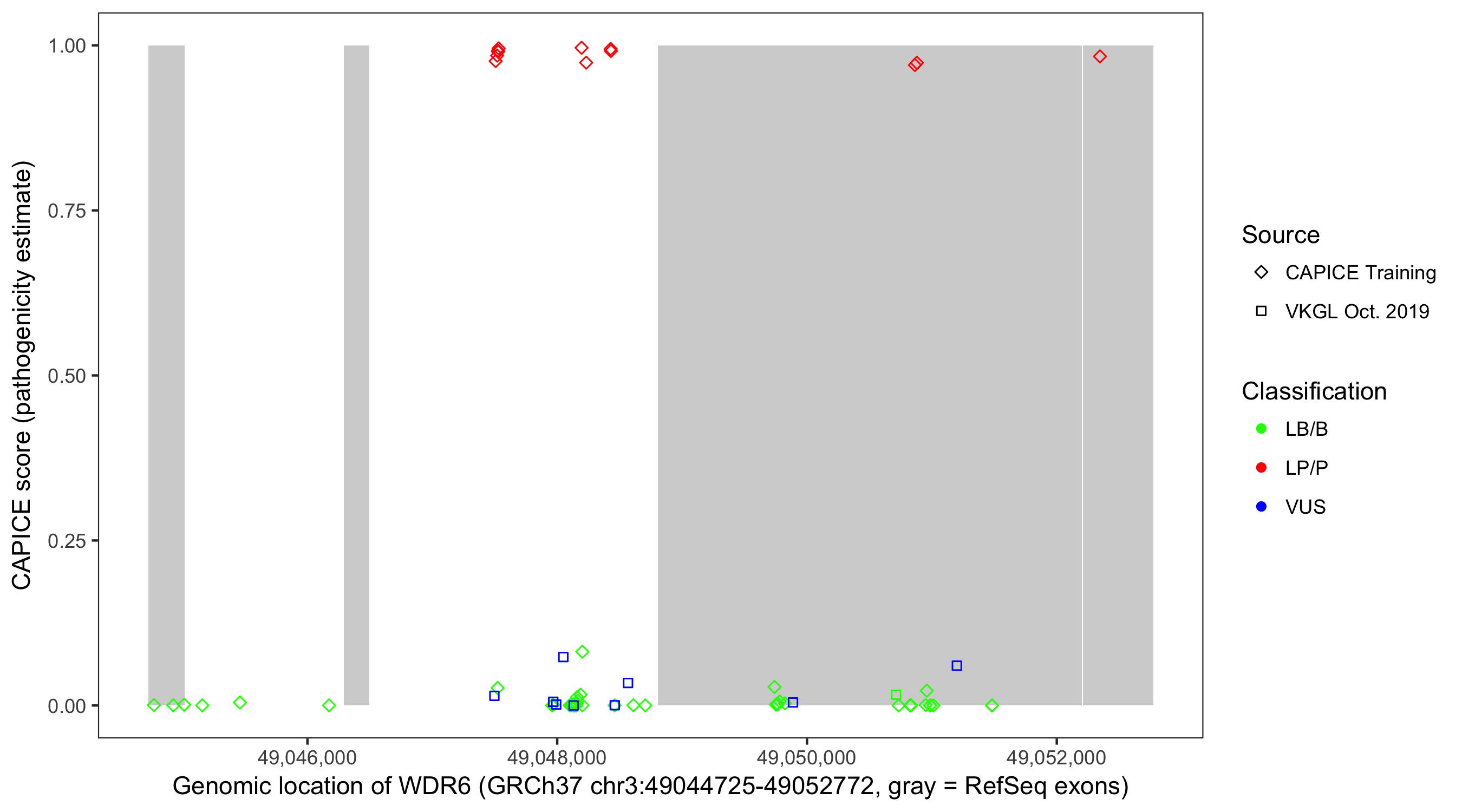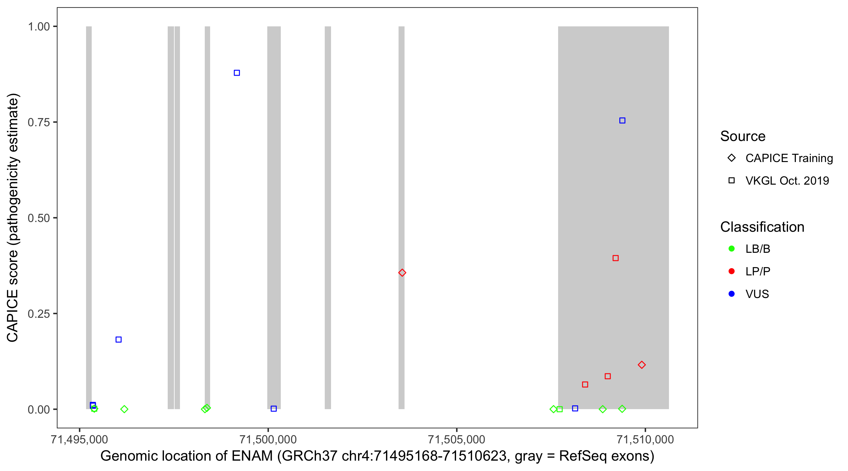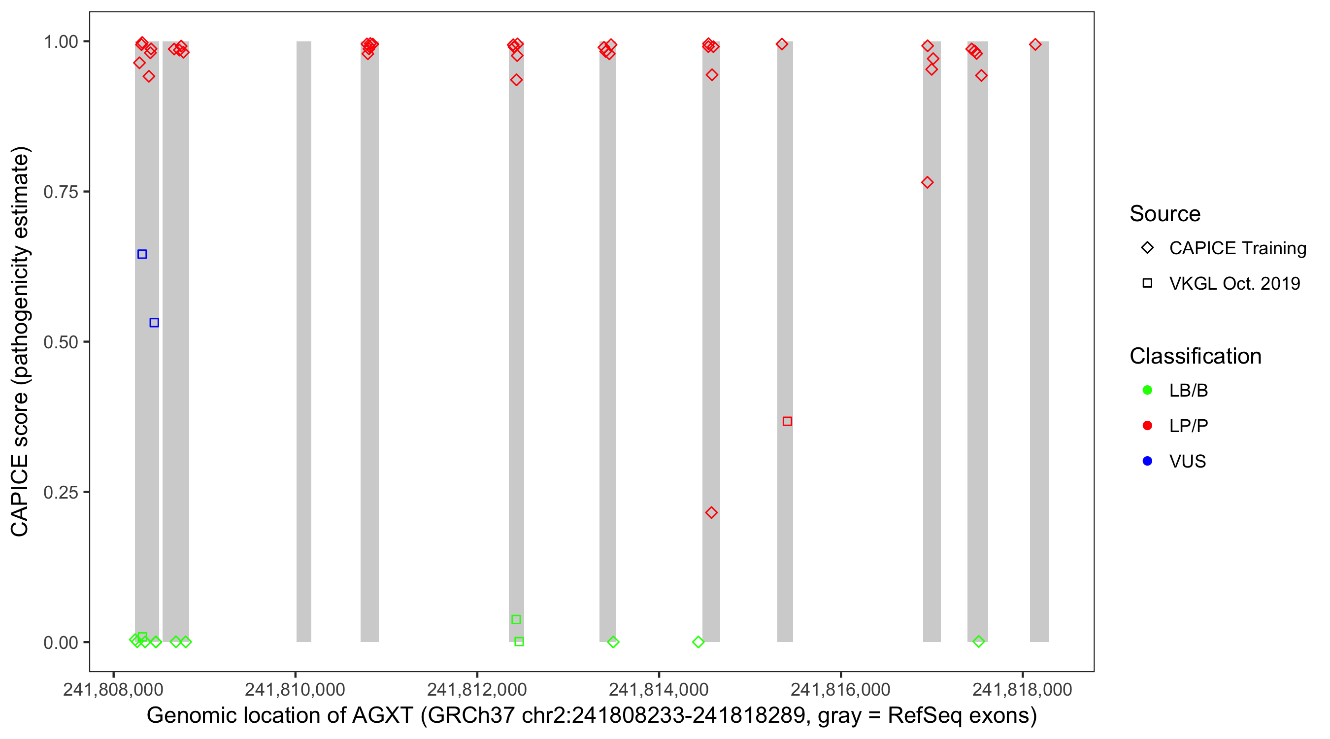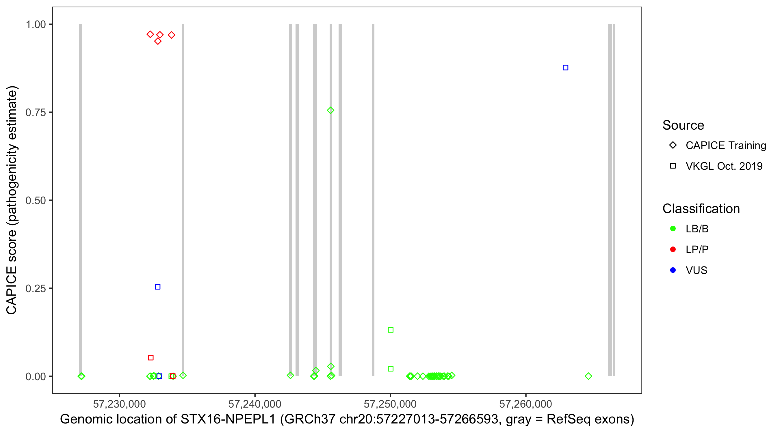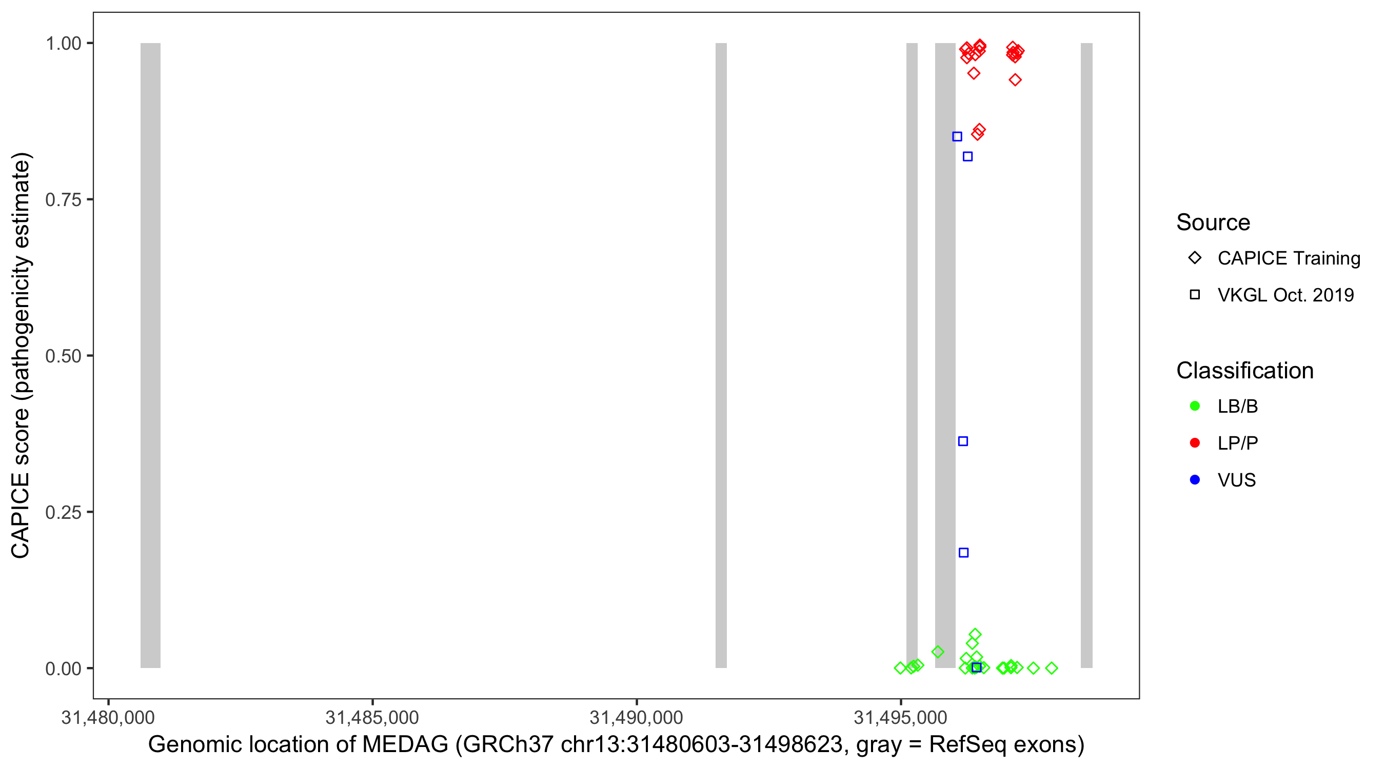 Shown are CAPICE train/test variants plus VKGL Oct 2019.