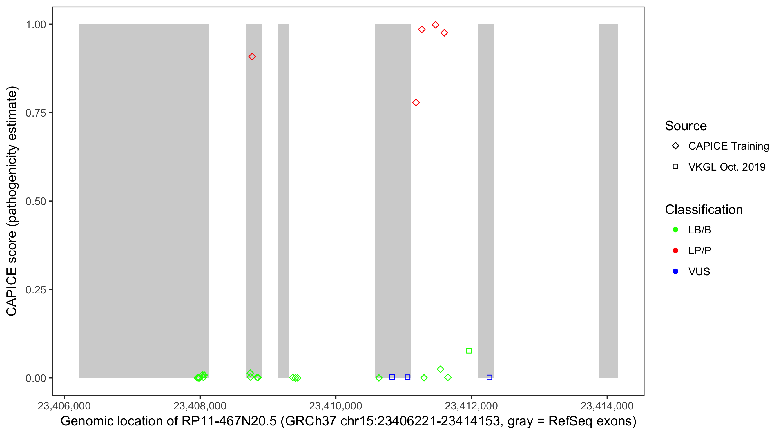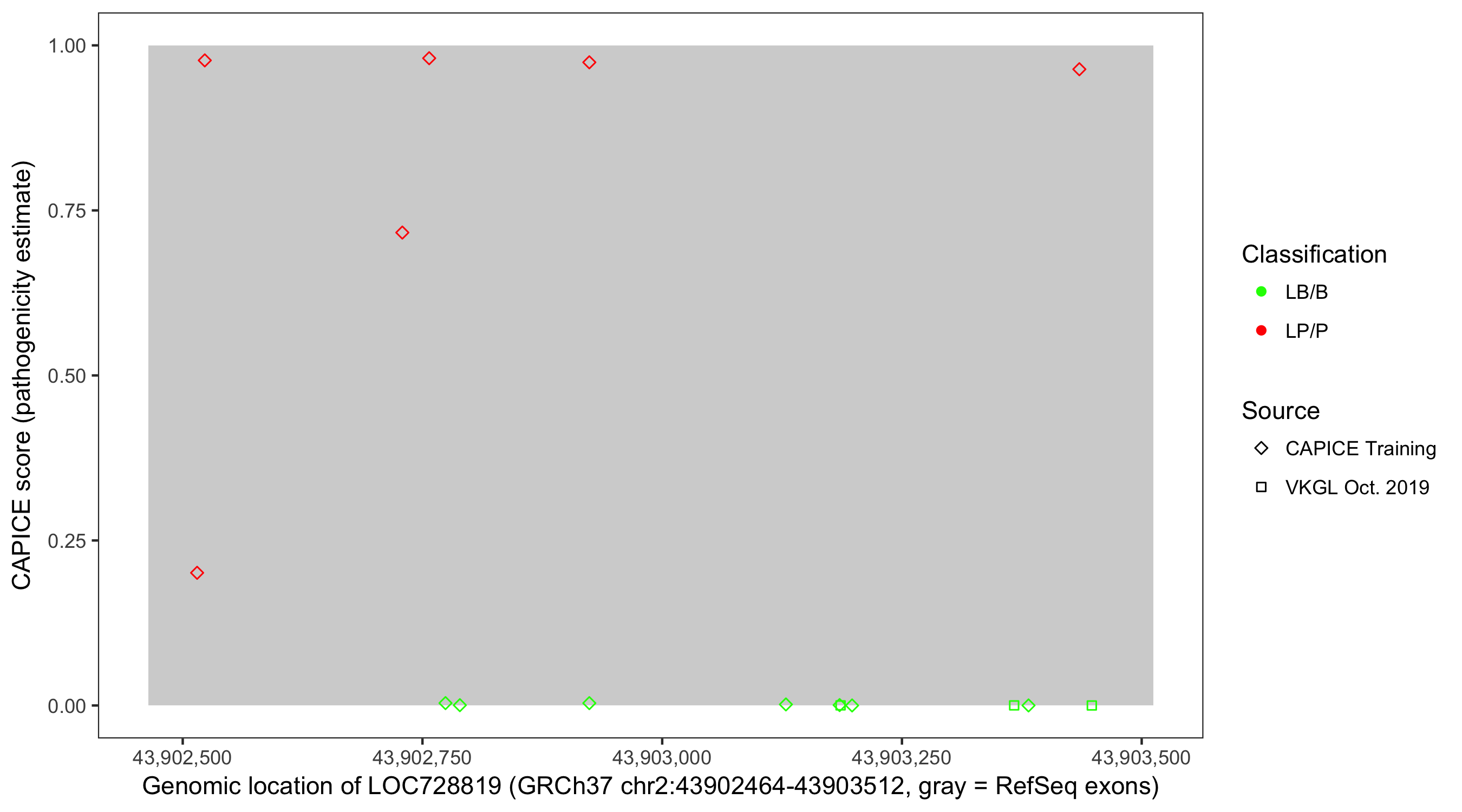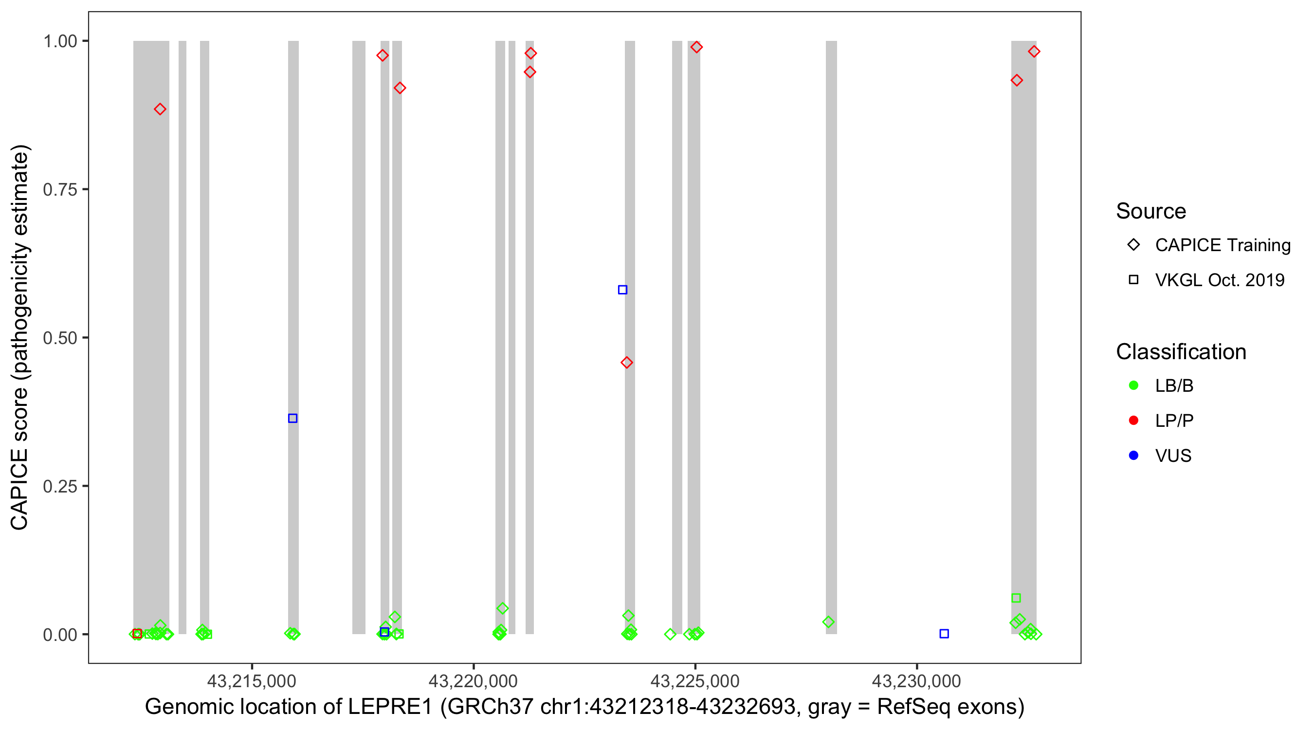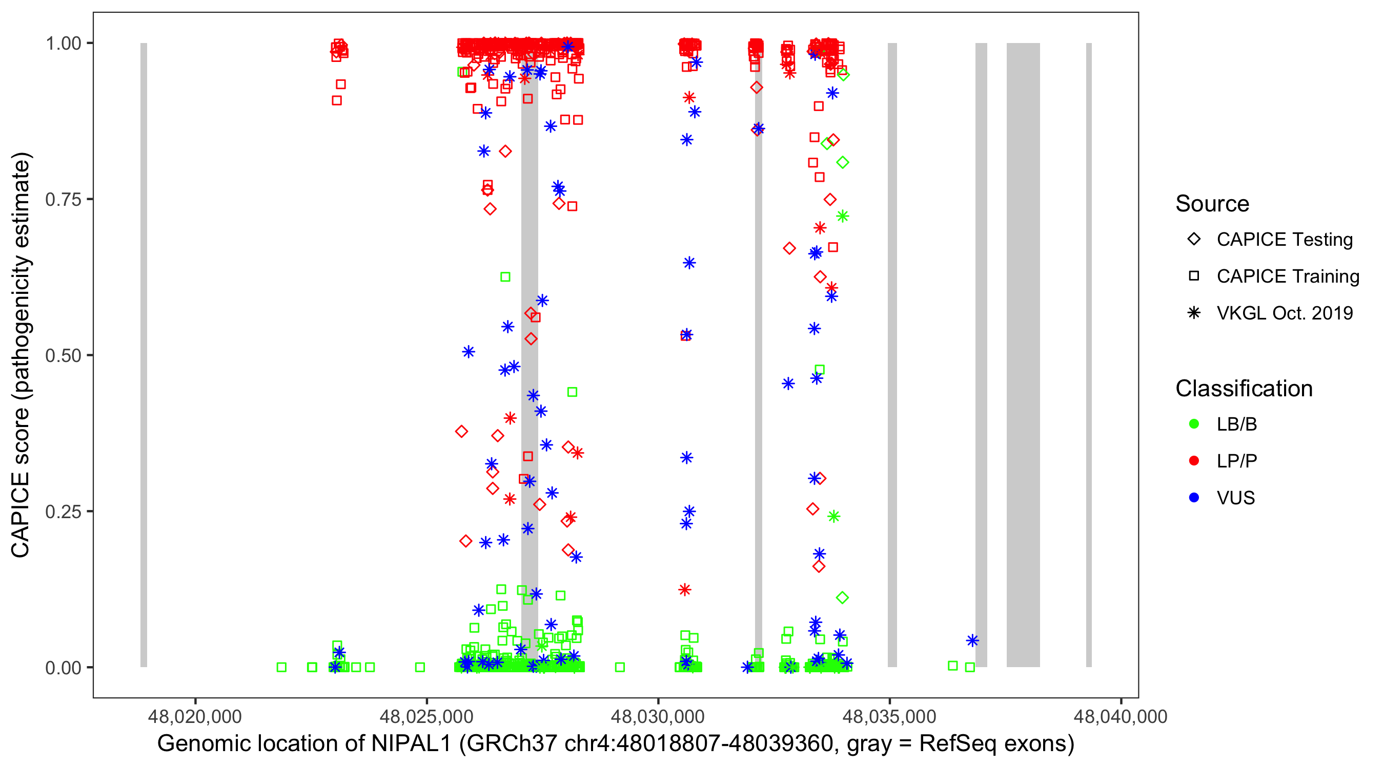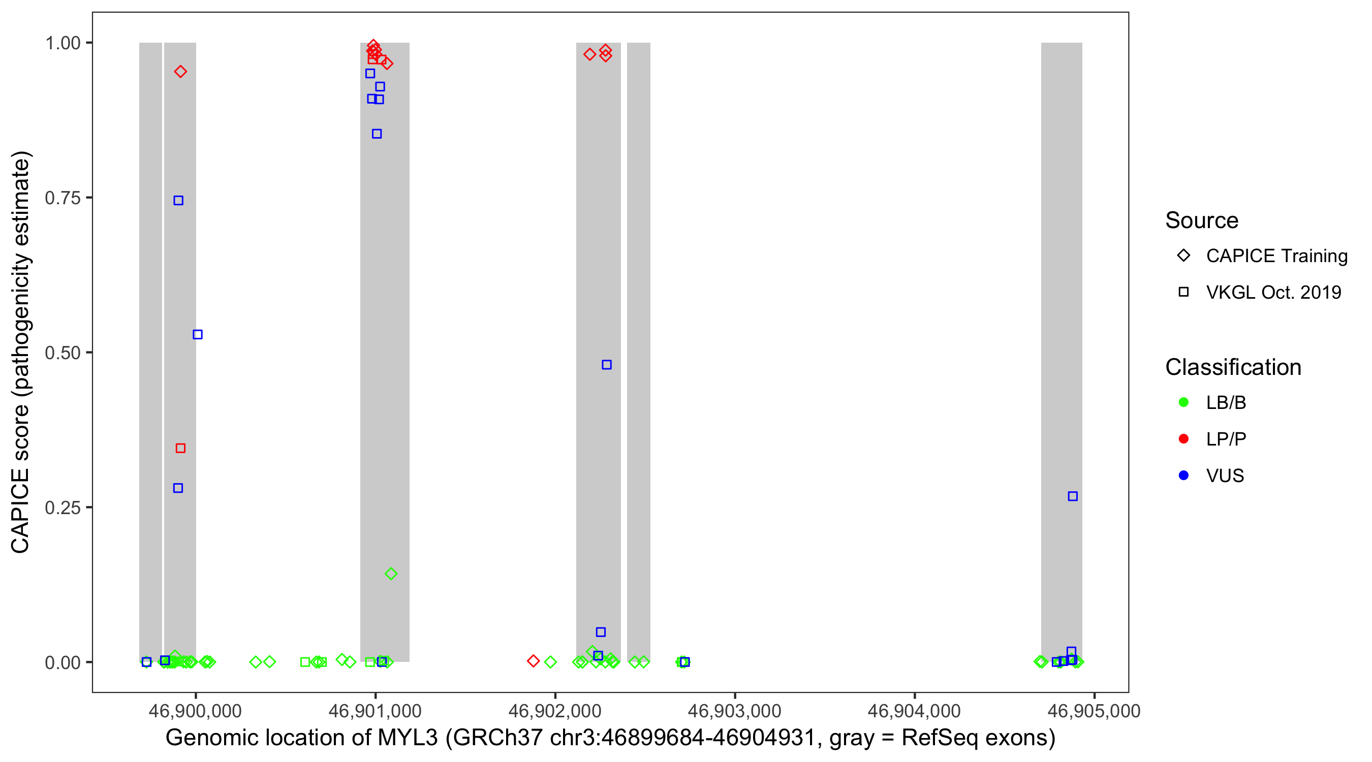 Shown are CAPICE train/test variants plus VKGL Oct 2019.